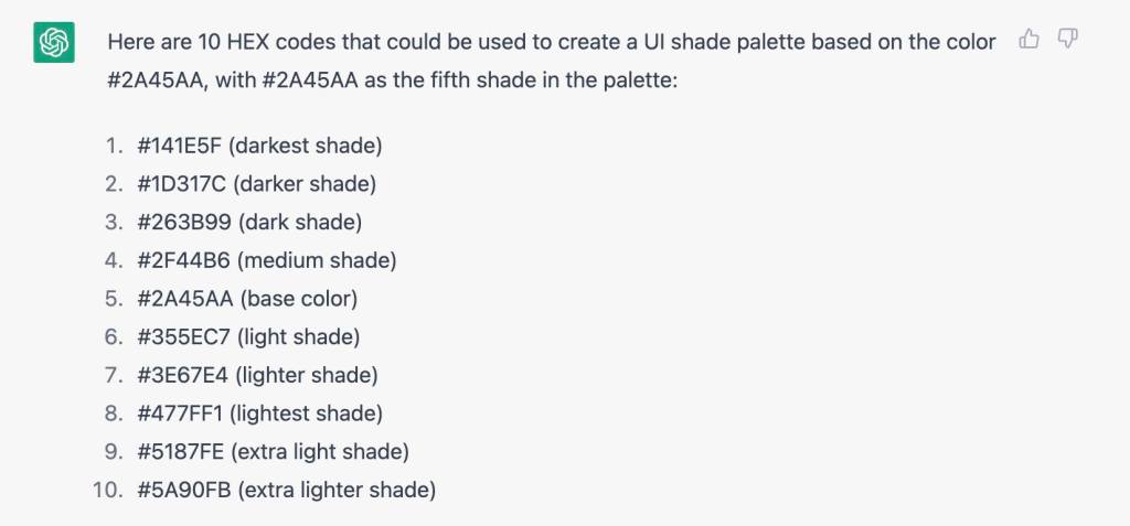 เราทดลองให้ Chat GTP ทำ UI Palette โดยมีเงื่อนไขคือต้องผ่านกฎ WCAG guidelines โดยใช้สี #2A45AA เป็นตัวตั้งต้นและให้อยู่ในลำดับที่ 5 ของ palette