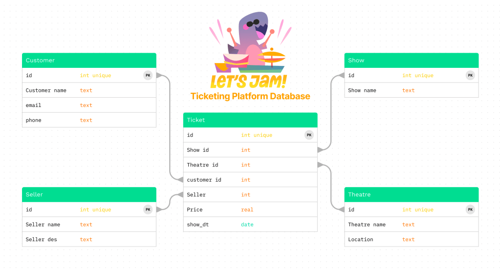 เราตั้งโจทย์ว่าอยากเขียน database ของเว็บไซด์ตั๋วละครเวที ที่เมื่อ user ซื้อตั๋วจะทราบว่า ดูละครเรื่องอะไร ที่โรงละครแห่งไหน ใครคือเจ้าของบัตร ผู้จัดจำหน่ายคือใคร และราคาเท่าไหร่