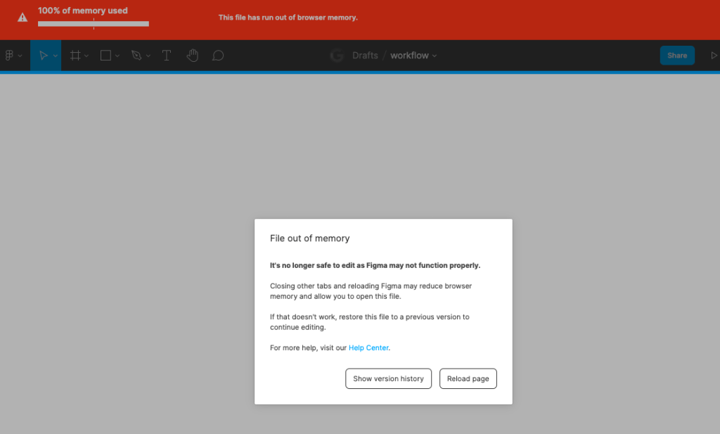 เคยเจอปัญหานี้กันบ้างรึเปล่านะ เวลาทำงานที่มีสเกลขนาดใหญ่จนโปรแกรม Figma ไม่สามารถรองรับได้ ด้านบนจะมี Banner สีแดงและเหลืองปรากฎอยู่ ซึ่งนั้นเป็นเหมือน Red Flag ที่เตือนเราว่าไฟล์งานที่เรากำลังทำอยู่มีขนาดใหญ่เกินไปและอาจจะไม่ถูกบันทึกแล้ว หรืออาจบึ้มเมื่อไหร่ก็ได้ 😥